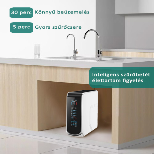 Nincs víztartály, nincs esetlegesen kialakuló pangó víz a rendszerben. A tisztavíz csapot megnyitva frissen szűrt tisztavíz folyik a pohárba!